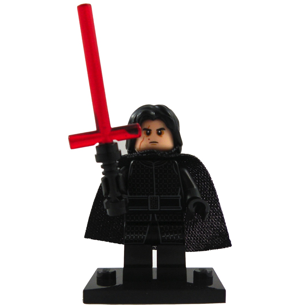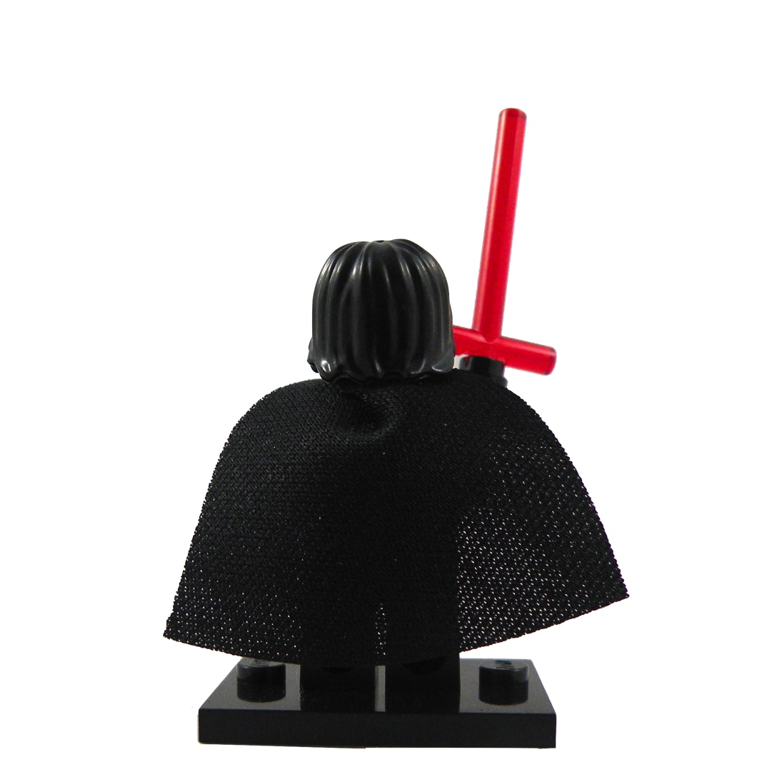 Visage fermé avec une cicatrice, sous ses cheveux noirs. Un deuxième visage est caché sous ces derniers, et il semble très en colère… Pour le reste, il est tout de noir vêtu, avec un « maillage » gris sur le torse, la ceinture et le haut du pantalon. Une cape souple, et son fameux sabre laser en forme de croix complètent l’ensemble. Une belle réalisation.