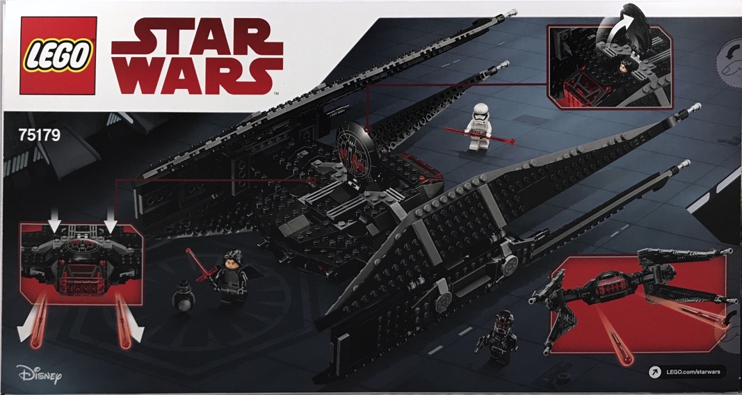 Un peu comme ce qu’elle contient, mais nous y reviendrons plus tard, la boîte est toute en longueur, avec notre vaisseau en train de tirer sur un ennemi que l’on ne voit pas, tandis qu’en arrière plan on devine un TIE Fighter en train de détruire ce qui semble être un Resistance Bomber. Une planète avec sa ceinture d’astéroïdes complètent l’ensemble. En bas, comme d’habitude, on voit les minifigs incluses dans le set : Kylo Ren, BB-9E, un First Order Stormtrooper et un First Order TIE Pilot.