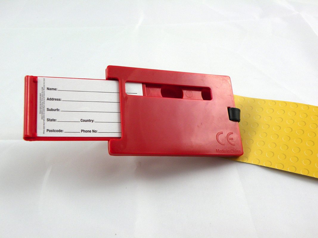 Un autre petit accessoire sympathique, que vous pouvez accrocher à votre valise et disposant d’un tiroir laissant apparaître le nom une fois fermé, et les coordonnées complètes sinon. Je ne l’ai pas trouvée ailleurs (du moins facilement achetable).