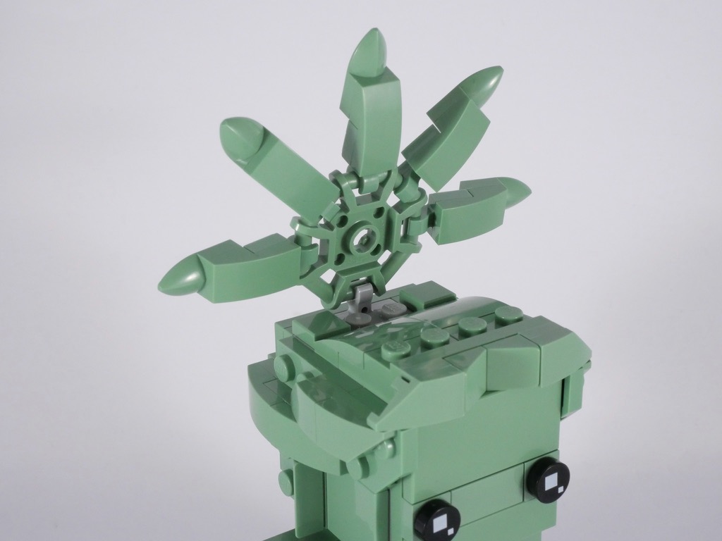 La construction est assez classique, vous ne serez pas dépaysé si vous êtes un adepte de la gamme LEGO BrickHeadz. On commence par le torse de la statue, décoré de quelques slopes vertes pour la toge. Les mains sont représentées par les clips habituels.