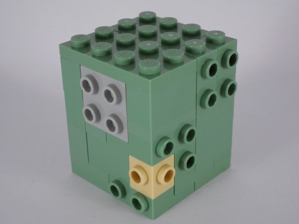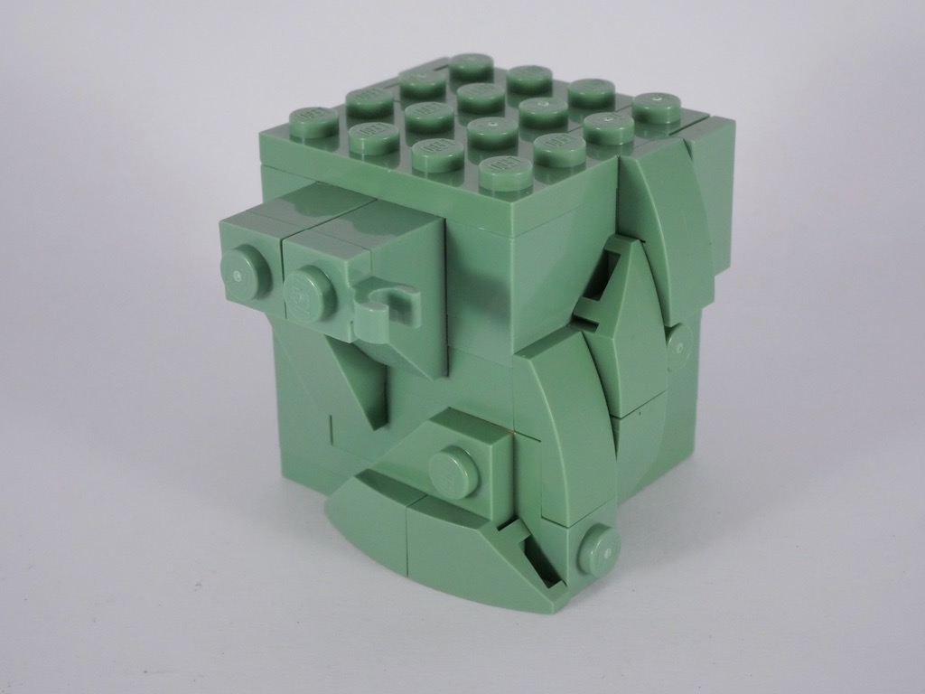 L’intérieur de la tête est constitué de 12 briques SNOT, que l’on vient ensuite habiller sur les 4 faces. On construit ainsi le visage, les oreilles et les cheveux qui dépassent de la couronne.
