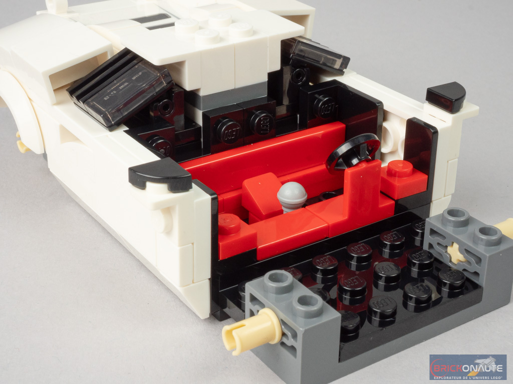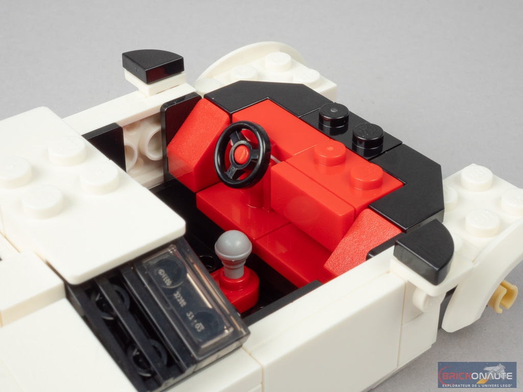 On se déplace vers l’avant, puis on ajoute les deux portières décorées de petits rétroviseurs. On s’intéresse alors à l’habitacle, joliment aménagé avec son tableau de bord de couleur rouge.