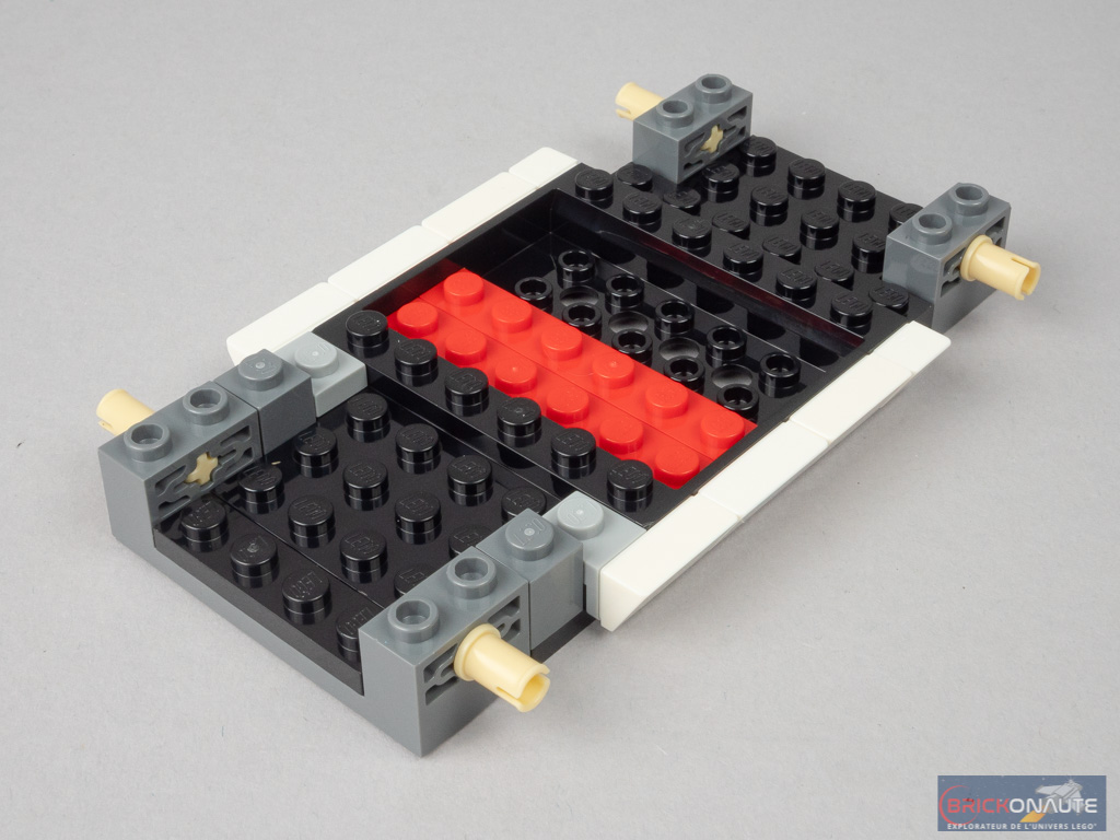 La voiture se base sur le châssis habituel de la gamme. On le prolonge de part et d’autre avec les deux essieux. Après avoir ajouté les bas de caisse, on se concentre sur l’arrière. La structure interne est ici particulièrement travaillée, avec des assemblages intéressants d’éléments SNOT et de charnières. On intègre, dans la structure, deux éléments Technic qui permettront la fixation des sous-ensembles formant les entrées d’air et la partie supérieure des feux.