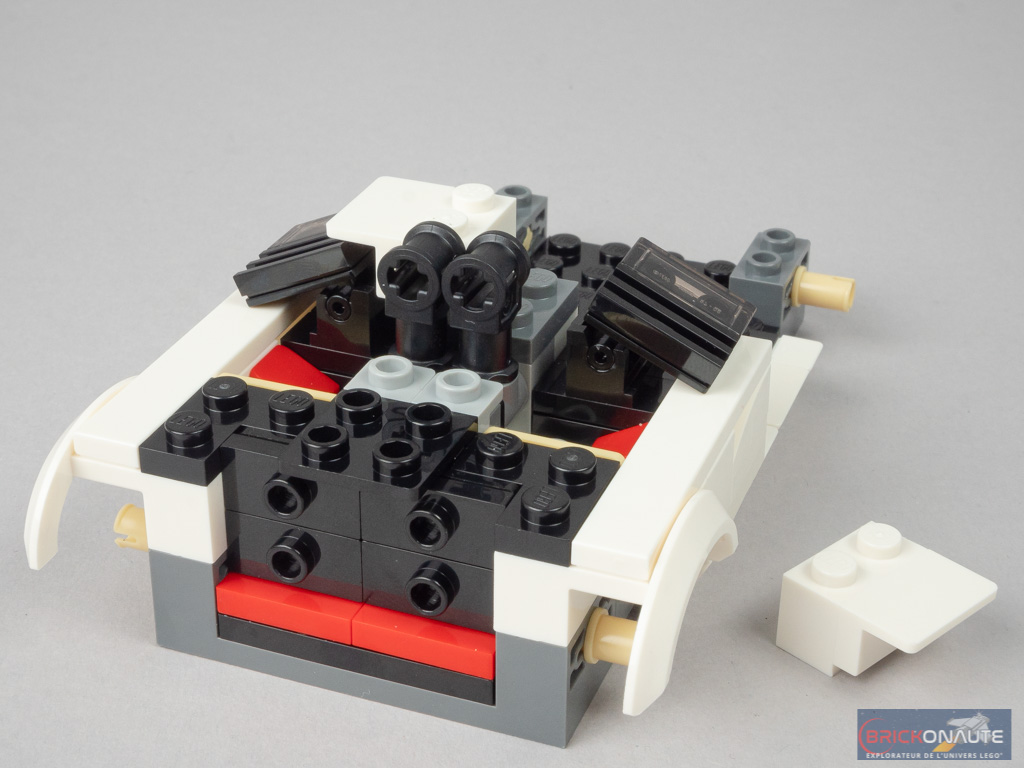 Un premier sous-ensemble forme le bas de caisse avant, on le fixe sur deux petites barres dépassant de la structure. On y voit deux autocollants, qui seront ensuite cachés et visibles par transparence sous les feux. Le sous-ensemble suivant forme le capot et les deux feux « plats ». Il se fixe sur deux charnières pour trouver l’angle désiré. On termine avec l’aileron, clipsé à l’arrière, la verrière, et enfin les 4 roues et leurs jolies jantes.