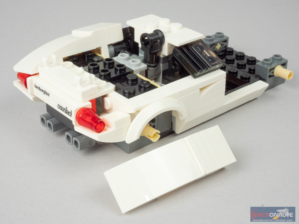 On passe ensuite à un grand sous-ensemble, comportant les deux cônes rouges translucides qui feront office de feux stop. En dessous, deux slopes incurvées sont fixées sur des clips, pour venir épouser la forme de ces cônes. Les 4 pots sont clipsés en partie inférieure, et une tile est décorée d’un autocollant portant l’inscription Lamborghini Countach. On fixe ce sous-ensemble à l’arrière, puis on construit deux sous-ensembles symétriques. Ils viennent s’insérer dans les pièces Technic de la structure, qu’on bascule ensuite pour former les 2 entrées d’air. C’est franchement malin, et le résultat est là. On termine cette étape avec un dernier sous-ensemble, décoré de deux autocollants, qui vient s’insérer entre ces deux entrées d’air.