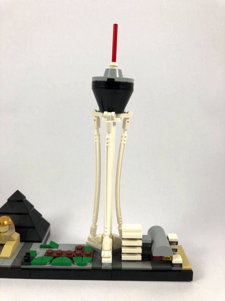 Nous passons ensuite au Stratosphere, où des pièces Technic flexibles sont utilisées pour retrouver la forme caractéristique de cette grande tour d’observation. Un cône noir inversé est disposé en haut pour la partie observatoire. Le casino et l’hôtel situés au pied de la tour ne sont pas représentés.