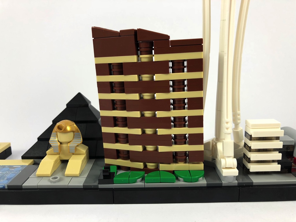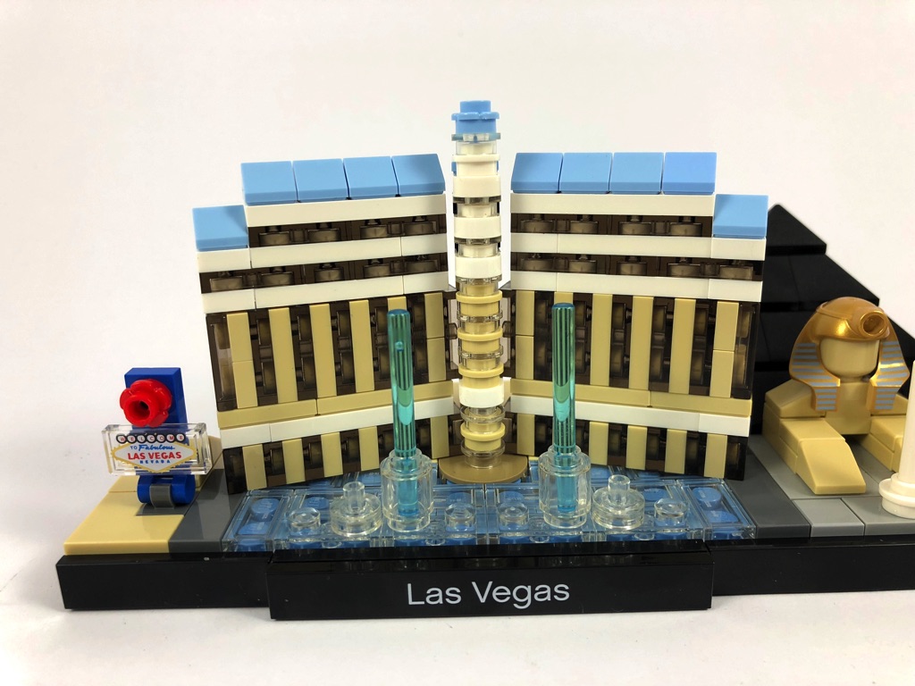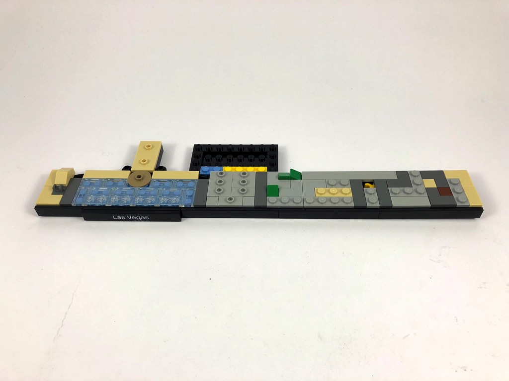 Le choix de Las Vegas pour une skyline LEGO Architecture s’imposait presque comme une évidence, tant la variété d’immeubles composant la ville est importante. LEGO a choisi ici d’en reproduire quelques uns des plus emblématiques de la « folie » architecturale de la Vice City. Les hôtels choisis permettent de proposer un éventail de couleur varié, et le mélange fonctionne bien. Bon choix de la part de LEGO sur ce point, et je pense que pour le coup l’intégration du Bellagio en lieu et place du Mandalay Bay est une vraie bonne idée.