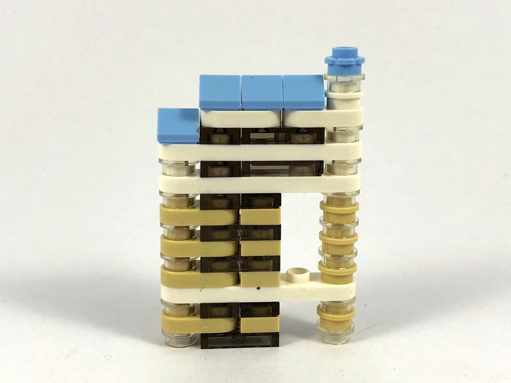 Il ne nous reste qu’un hôtel et pas des moindres : le Bellagio. Il s’agit de la construction la plus détaillée du modèle. On remarquera l’utilisation de techniques SNOT (Studs Not On Top) permettant de placer des plates verticalement afin de représenter les rangées de fenêtres. Dommage que les clips utilisés pour la construction restent visibles depuis l’arrière du modèle. Mais il ne sera généralement pas exposé de ce côté ! Deux sabres lasers en trans light blue sont ajoutés pour la fontaine.