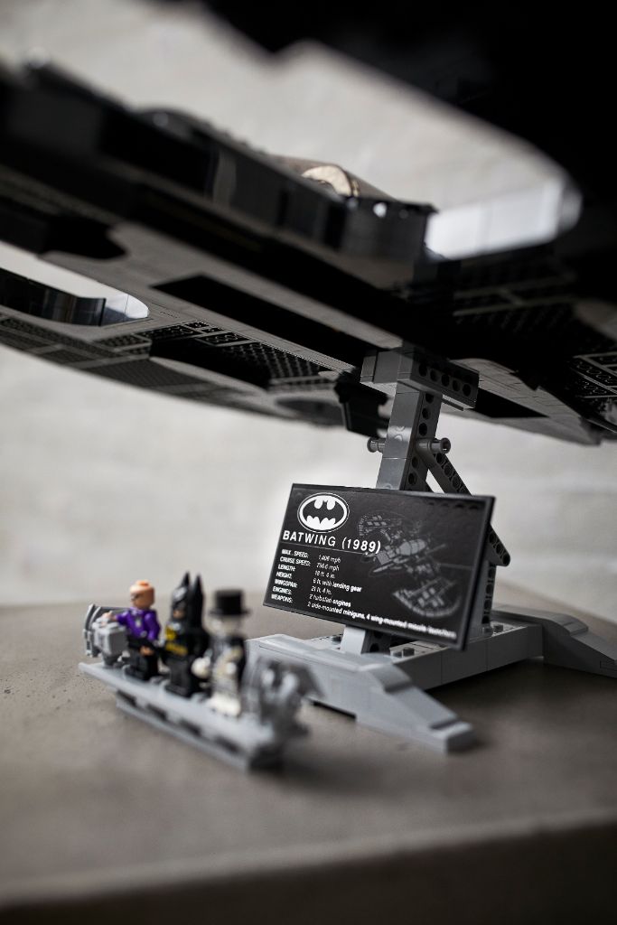 Avec cette boîte, LEGO nous propose son interprétation de l’engin volant piloté par Batman dans les films de Tim Burton. Il mesure 52cm de long par 58cm de large, pour 11cm de haut. LEGO a prévu deux possibilités pour l’exposer : sur le support fourni, ou accroché au mur.
