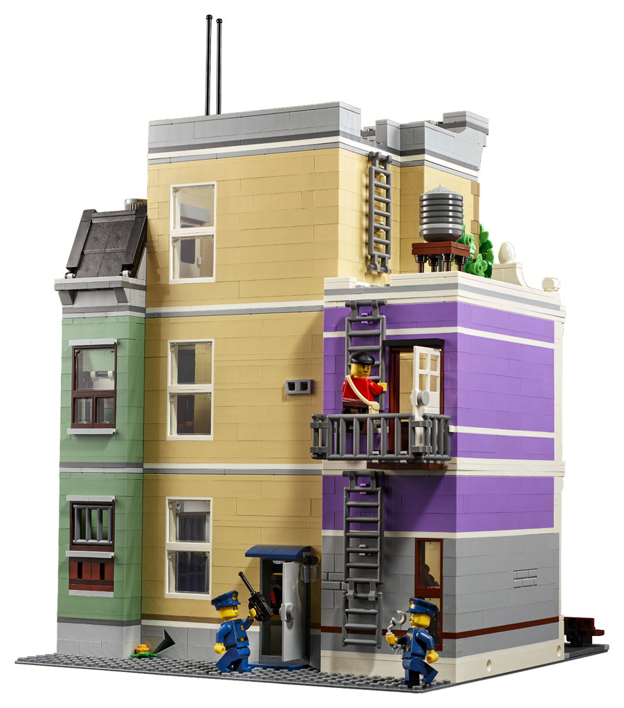 Deux petits bâtiments accompagnent le commissariat. Il s’agit d’un magasin de donuts (il paraît que les policiers aiment ça !) et d’un kiosque à journaux. On y trouve également 5 minifigs dont 3 policiers en tenue « vintage » des années 1940, un marchand de journaux – voleur, et une marchande de donuts.