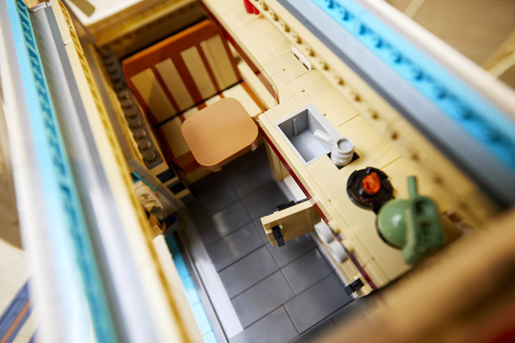 Vous vous en doutez, l’intérieur n’est pas en reste et est joliment aménagé avec des armoires, un réfrigérateur, un évier et même une cuisinière à gaz avec une théière. LEGO propose également quelques accessoires pour accompagner le van, avec une planche de surf et deux chaises pliantes.