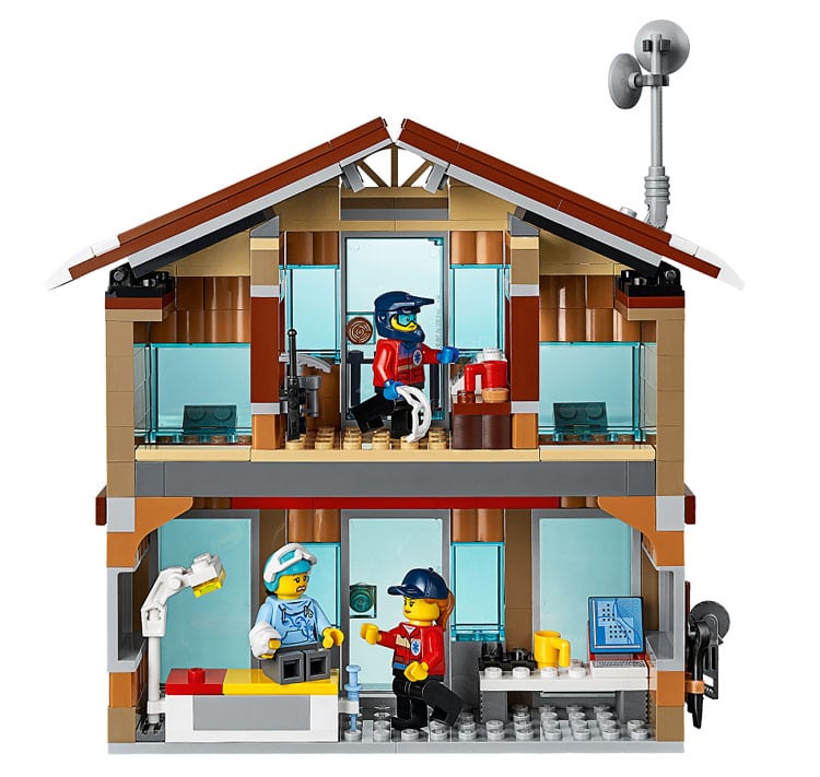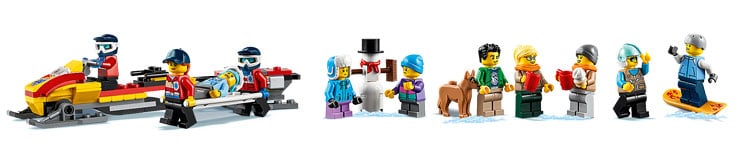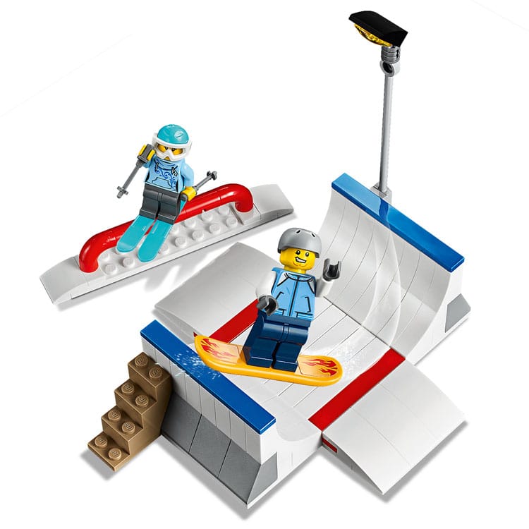Le set compte 806 pièces dont 11 minifigs. Au menu, un morceau de station de ski avec son poste de sauvetage et son magasin, un chasse-neige, un morceau de half-pipe, une motoneige ou encore un hélicoptère. Et parmi les minifigs des sauveteurs, un snowboardeur, des marchands… il y a de quoi faire.