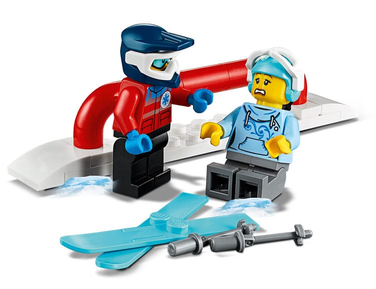 Le set compte 806 pièces dont 11 minifigs. Au menu, un morceau de station de ski avec son poste de sauvetage et son magasin, un chasse-neige, un morceau de half-pipe, une motoneige ou encore un hélicoptère. Et parmi les minifigs des sauveteurs, un snowboardeur, des marchands… il y a de quoi faire.