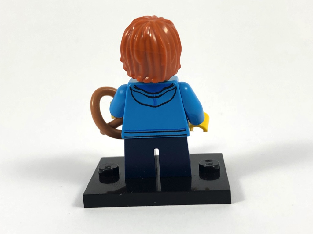 Cette deuxième minifig représente un enfant, reconnaissable notamment à ses petites jambes non pliables. Elles sont de couleur dark blue, et il porte au-dessus un sweat-shirt bleu, dont on aperçoit le zip , les poches et les cordelettes de la capuche sur le devant, et la capuche sur l’arrière. On en distingue même la ceinture élastique. Notre garçon est souriant et a de jolies tâches de rousseur sous sa chevelure rousse, avec une belle mèche dépassant sur le haut du visage. Il a droit à un bretzel, sait-on jamais qu’il ait un petit creux en écoutant les histoires d’Andersen. Cette seconde minifig est, à mon goût, nettement mieux réussie et détaillée que celle de l’auteur. J’aurais préféré dire l’inverse.