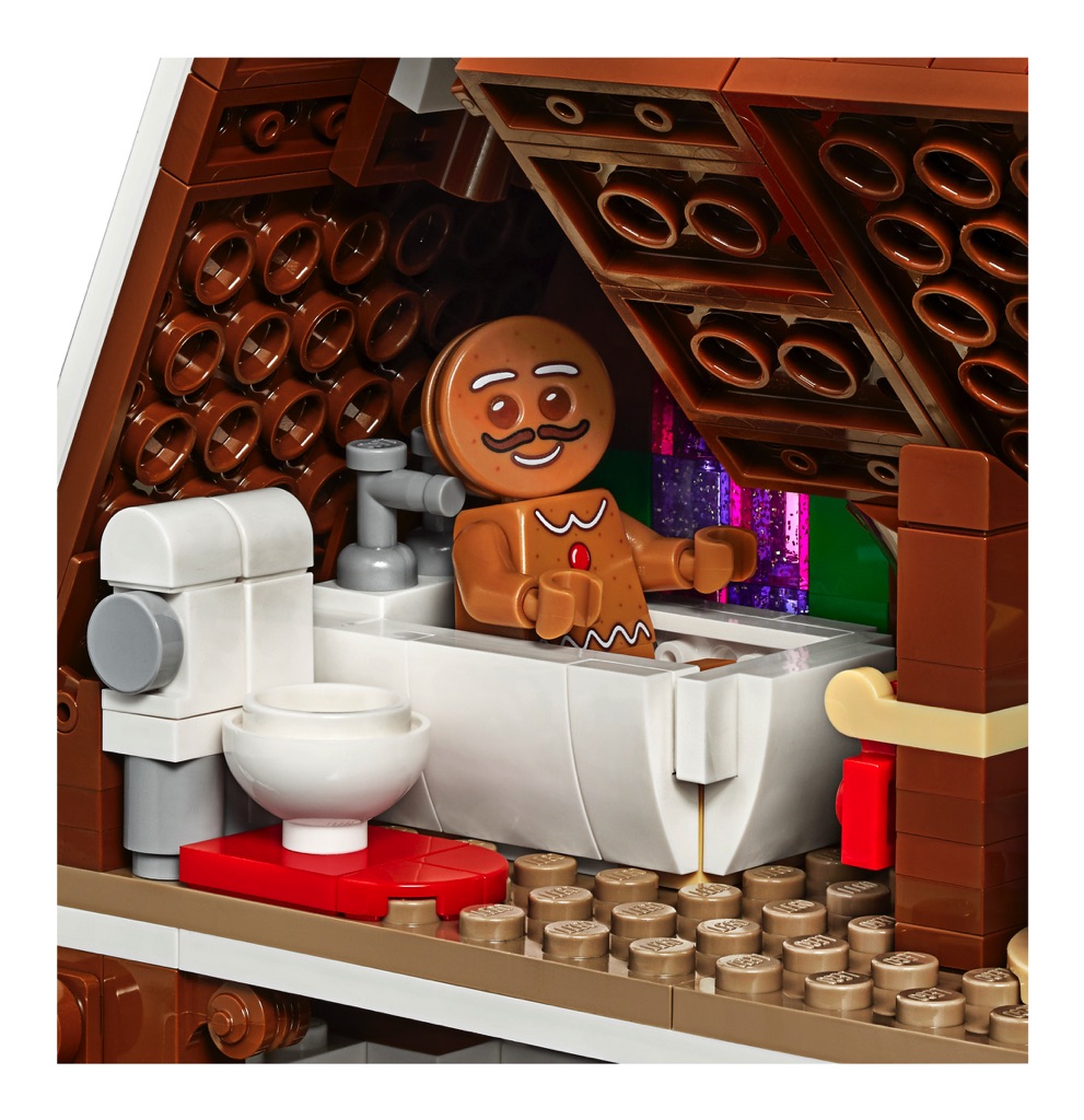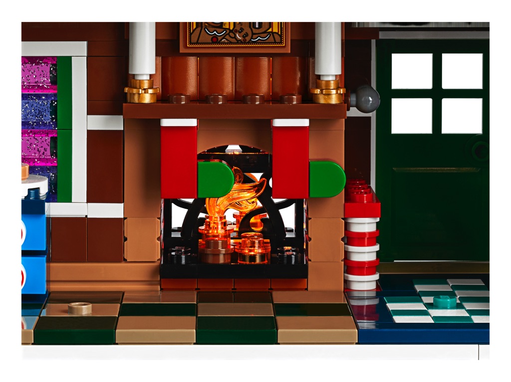 LEGO nous propose de construire une maison en pain d’épices, son toit orné de bonbons colorés, ses fenêtres pailletées et sa cheminée. L’intérieur n’est pas en reste : on y retrouve bon nombre de mobiliers dont un lit et un fauteuil en chocolat, une cuisine avec sa hotte ou encore une salle de bains équipée d’une baignoire et de toilettes. Il est même possible d’illuminer le feu dans la cheminée, grâce à une brique lumineuse actionnable en appuyant sur la fumée sortant de cette cheminée.