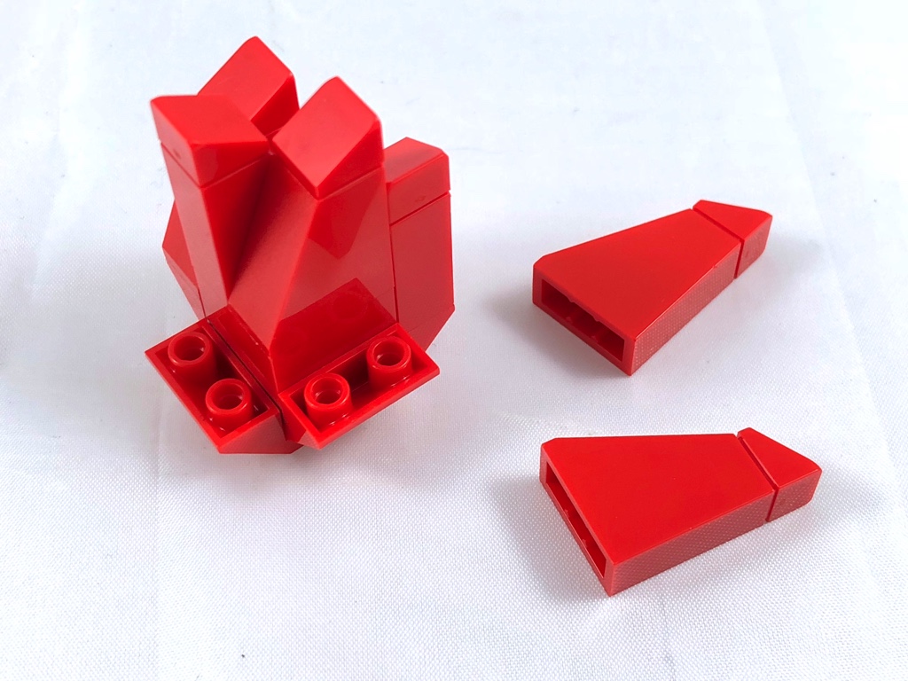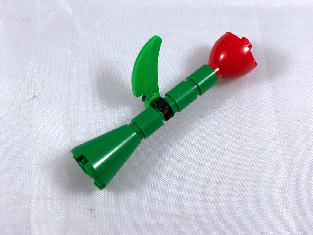 Le pot de cette tulipe vaut vraiment le détour, avec ses slopes assemblées sur un support composé de briques SNOT. La tige est identique à celle assemblée pour la marguerite. La fleur est construite sur une base composée de deux Slopes, Inverted 45 4 x 2 Double superposées permettant d’obtenir un décalage de niveau bien trouvé. On assemble tout autour et à l’intérieur 6 ensembles composés d’une grande slope rouge surmontée d’une petite cheese slope. C’est tout bête, mais le rendu est vraiment réussi.