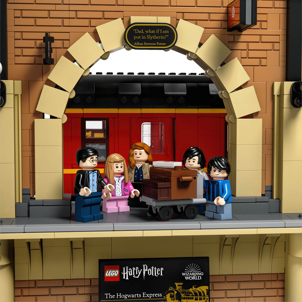 Il s’agit donc d’une reproduction à l’échelle 1:32 du Poudlard Express avec sa locomotive, son tender et un wagon de passager. Un wagon qui propose la reproduction de 3 scènes cultes de la saga, illuminées individuellement par une pression sur le toit. Parmi les scènes reproduites, on retrouve la rencontre de nos 3 héros lors du 1er volet, Lupin sauvant Harry du Détraqueur (3ème opus) et Luna délivrant Harry du sortilège de Drago (6ème film). Sur la portion de quai de King’s Cross représentant la voie 9¾, LEGO nous propose une dernière scène dans laquelle Harry et Ginny accompagnent leurs enfants qui se rendent à Poudlard.