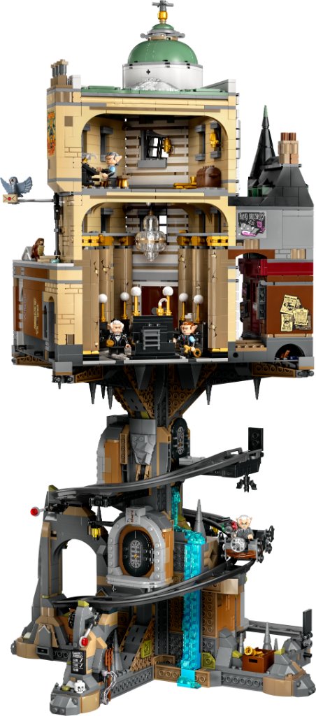 Au programme de ce set, LEGO nous propose donc son interprétation de la banque Gringotts et du chemin de fer / montagnes russes qui mène aux coffres situés sous cette dernière. On y trouve également un dragon Pansedefer Ukrainien, à poser sur la banque pour reproduire la fameuse scène d’Harry Potter et les Reliques de la Mort.