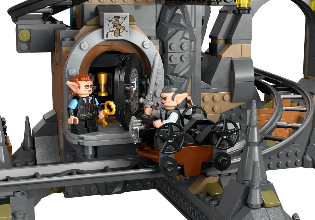 Au programme de ce set, LEGO nous propose donc son interprétation de la banque Gringotts et du chemin de fer / montagnes russes qui mène aux coffres situés sous cette dernière. On y trouve également un dragon Pansedefer Ukrainien, à poser sur la banque pour reproduire la fameuse scène d’Harry Potter et les Reliques de la Mort.