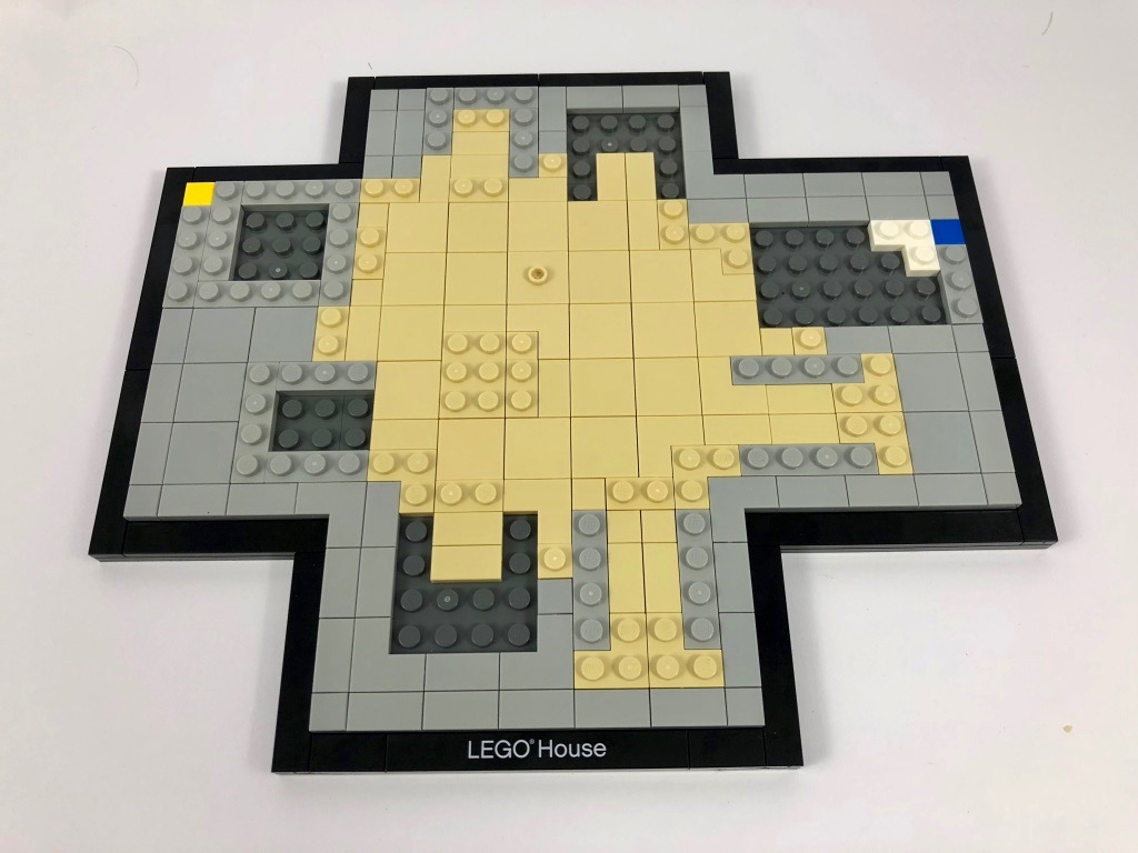 Comme tout set LEGO Architecture qui se respecte, la construction de la LEGO House commence par le support qui va l’accueillir. Il prend une forme de croix, dont toutes les extrémités ne font pas la même longueur. Ce sont en fait 2 rectangles qu’on aurait superposés, l’un de 28 tenons de long, l’autre de 24. Une fois cette base assemblée, on la « pave » de tiles et de plates, pour l’essentiel grises et beiges (tan).