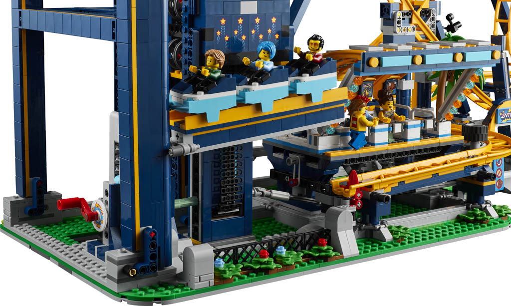 Et il faudra un peu de place pour l’exposer, puisque l’ensemble mesure 85cm de long, 34cm de profondeur, et 92cm de hauteur ! Les wagonnets sont acheminés en haut du parcours par un ascenseur, motorisable avec le système Powered Up!, mais il faudra repasser à la caisse. Il faudra sinon se contenter d’actionner une manivelle.