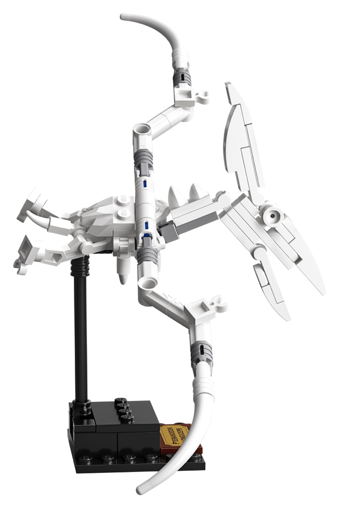 - Un superbe ensemble de fossiles de dinosaures très détaillé, avec des squelettes de Tyrannosaurus rex, de tricératops et de ptéranodon à l’échelle 1:32, chacun accompagné d’un présentoir pour créer une exposition LEGO® de type musée d’histoire naturelle.