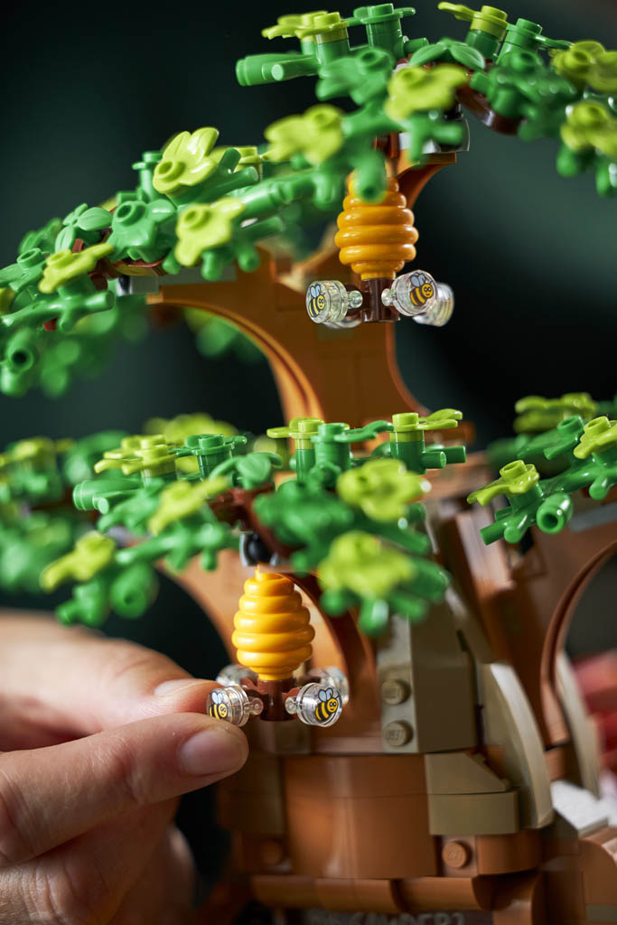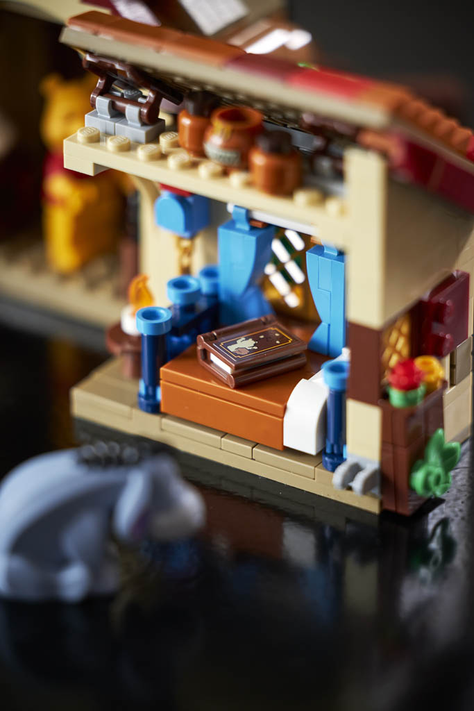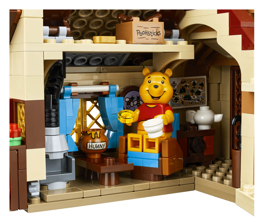 Au programme de ce set qui semble à première vue plutôt réussi, une reproduction de la maison de Winnie l’Ourson sous un chêne avec ses ruches et ses abeilles, dans la Forêt des Rêves Bleus (Hundred Acre Wood en VO). La maison s’ouvre en deux pour accéder à l’intérieur joliment aménagé.
