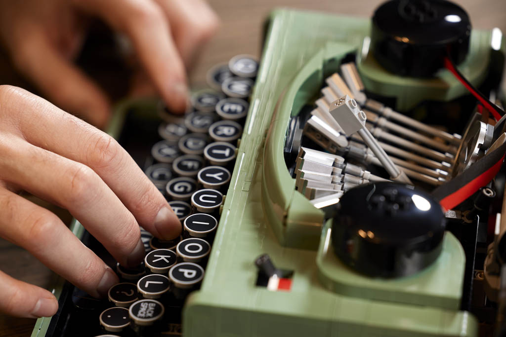Le set s’inspire du projet de Steve Guinness, vainqueur de la première saison de LEGO Masters au Royaume Uni et intitulé LEGO Typewriter. Il abandonne la couleur noire pour une jolie livrée sand green, et intègre quelques fonctionnalités intéressantes. Le fait d’appuyer sur les touches permet de déplacer l’unique marteau mobile, et de décaler le chariot d’un cran – il faut alors le ramener à la main.