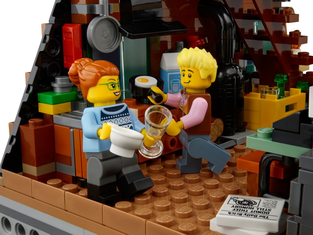 On retrouve un salon, un bureau et une kitchenette au rez-de-chaussée, et une chambre à l’étage. On remarquera aussi les beaux arbres, un canoë, et une jolie collection d’animaux. Et pour la peupler, quatre minifigs. À la manière d’un bâtiment modulaire, les toits et l’étage se retirent pour pouvoir facilement accéder à l’intérieur.