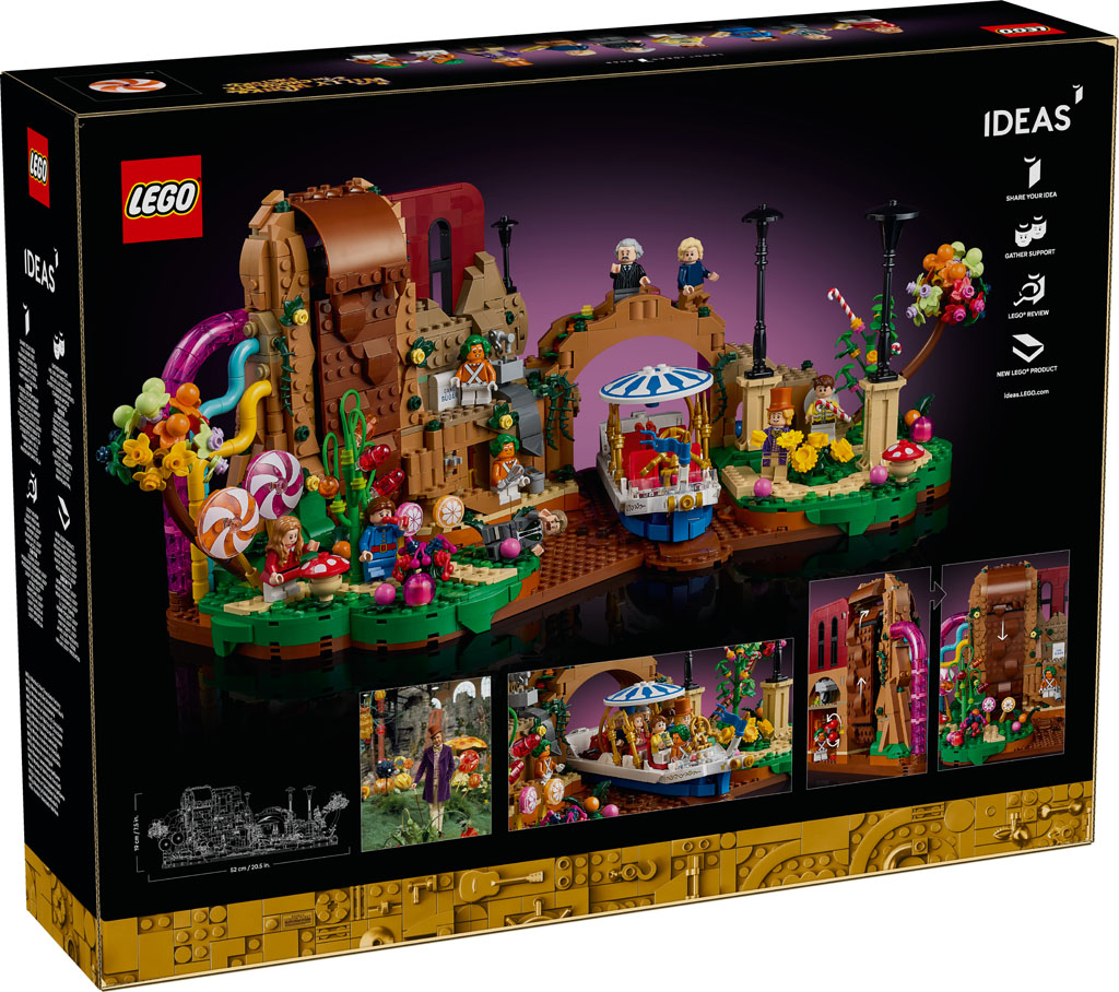 Si le fan designer s’était inspiré du livre de Roald Dahl, le set final s’inspire plutôt du film de 1971 Willy Wonka & the Chocolate Factory (Charlie et la Chocolaterie pour son titre français) avec Gene Wilder dans le rôle titre. Il s’agit ici d’une des premières scènes se déroulant dans la chocolaterie avec ses friandises, sa cascade de chocolat (actionnée par une molette au dos du modèle) et le bateau emmenant les heureux possesseurs du ticket d’or en balade.