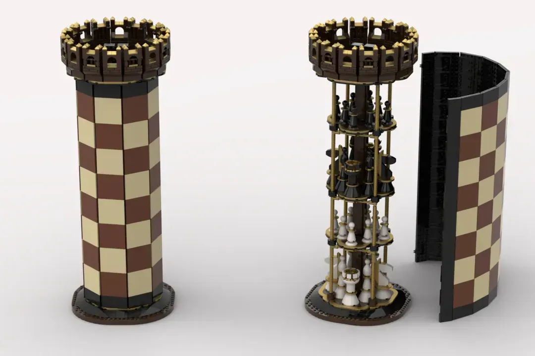 Tower Chess, de Ferbrick1, nous propose un jeu d’échecs un peu particulier. Fermé, il prend la forme d’une tour à l’intérieur de laquelle sont rangées les différentes pièces sur des petites plateformes, le plateau venant « s’enrouler » autour. Une petite poignée en haut de cette tour permet de déplacer l’ensemble.