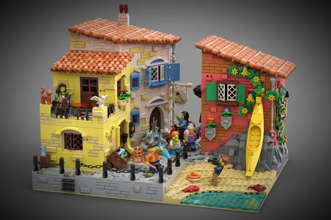 Pour ce projet aux maisons colorées, l’auteur nous indique s’être inspiré des villages des Cinque Terre, dans le nord de l’Italie. On y trouve un glacier, un fleuriste et un poissonnier, tandis que le 1er étage des maisons abrite un espace de vie. On remarquera également une petite place et un morceau de plage.