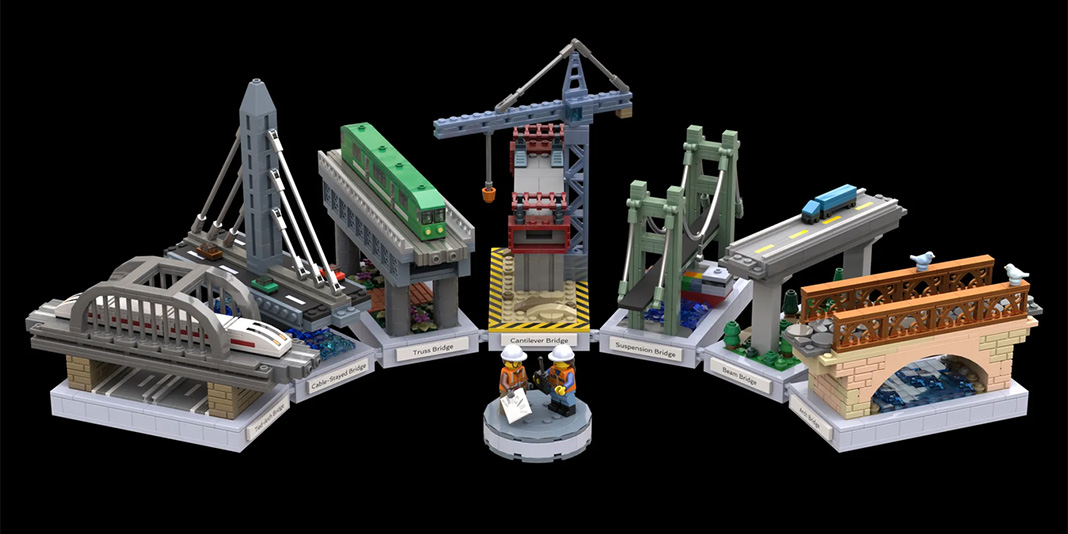 The World of Civil Engineering: Types of Bridges, par MOCingbird, nous propose en effet une reconstitution de 7 types de ponts différents – du pont à haubans au pont à poutres, en passant par le classique pont voûté.