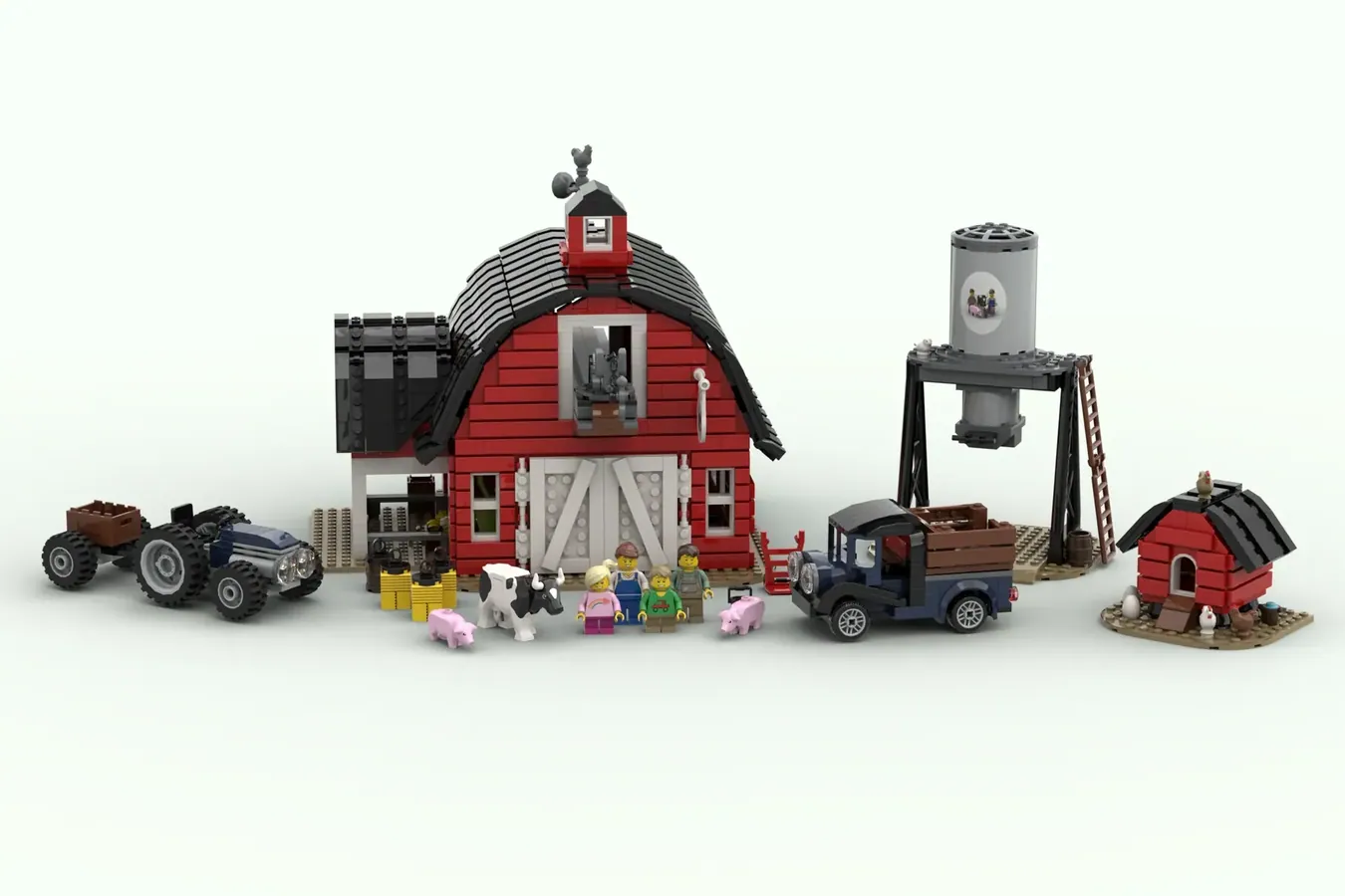Direction la ferme, pour ce projet dont j’ai déjà pu vous parler il y a quelques temps. On y retrouve une grange (qui s’ouvre sur le côté pour accéder à l’intérieur), un poulailler, un silo, un tracteur et une camionnette.