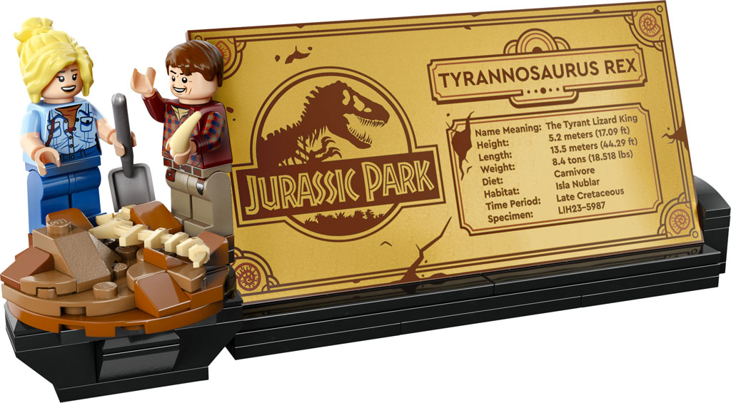 Il sera possible d’ajuster sa pose et notamment la position de sa tête, de sa queue, de ses pattes avant et de sa mâchoire. Il est accompagné d’une plaque signalétique avec quelques facts et de deux minifigs : Alan Grant et Ellie Sattler.