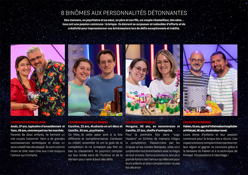 Du côté des candidats, ce seront 8 binômes qui s’affronteront pour tenter d’empocher les 20 000 € mis en jeu. Avec comme toujours des personnalités bien différentes : le « couple chamailleur », les « potes d’Armor » ou encore les « Stranger Bricks ».
