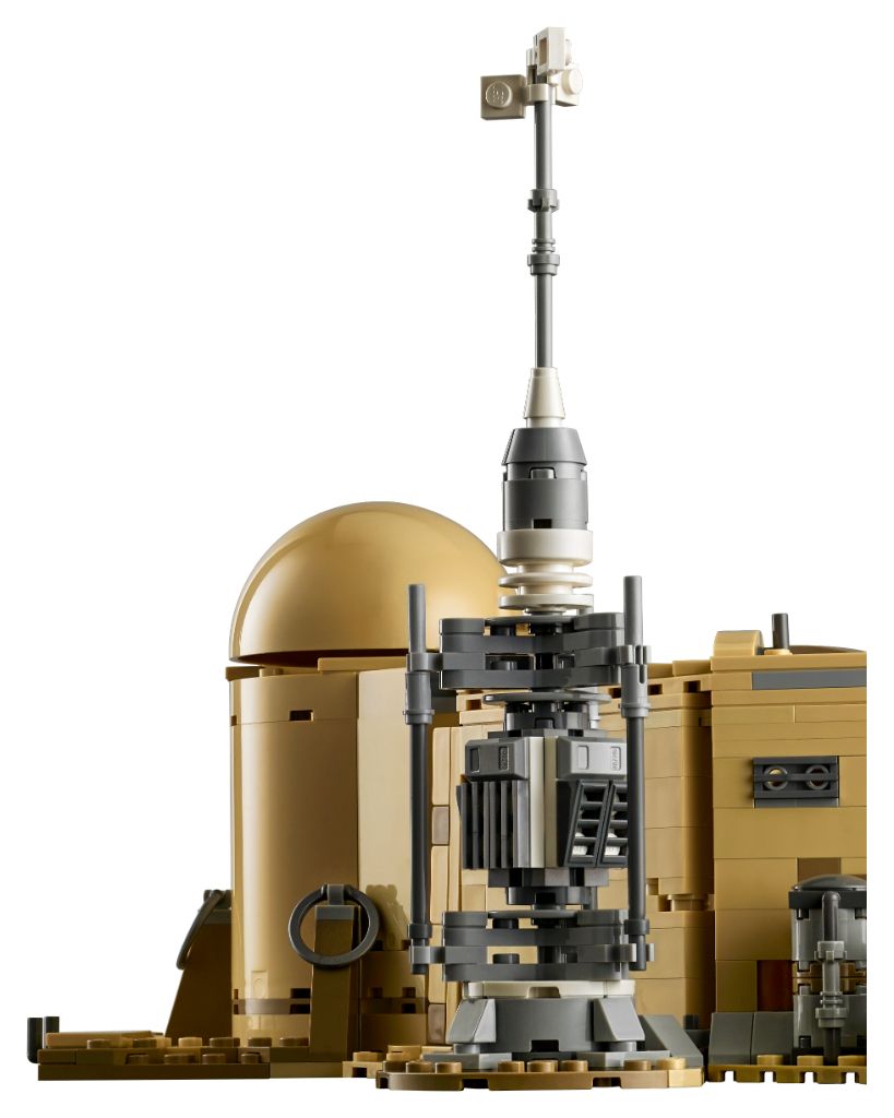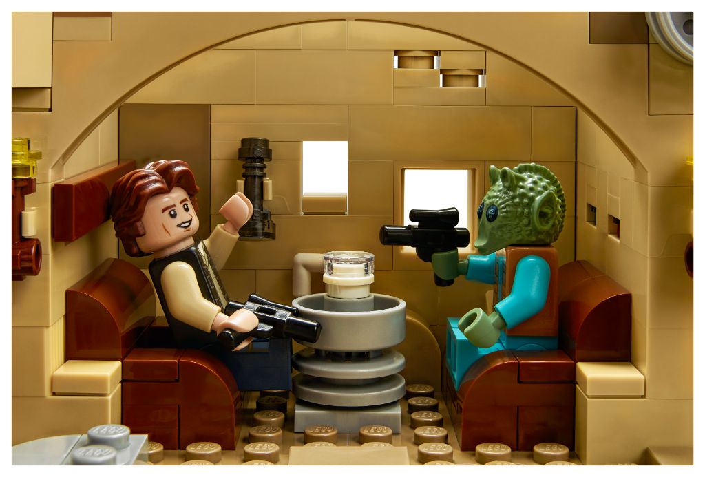 Comme vous le voyez sur les images, tout ceci est superbement détaillé. Qu’il s’agisse du bar, des différentes alcôves, et de la finition extérieure du bâtiment : rien n’est laissé au hasard. Un second bâtiment est également à construire et peut être attaché à la construction principale. Construction principale qui peut être ouverte en deux pour accéder à l’intérieur, comme vous pouvez le voir juste au-dessus. On trouve aussi deux landspeeders, dont un n’a jamais été adapté jusqu’ici en LEGO, un Dewback et son enclos avec un abreuvoir.