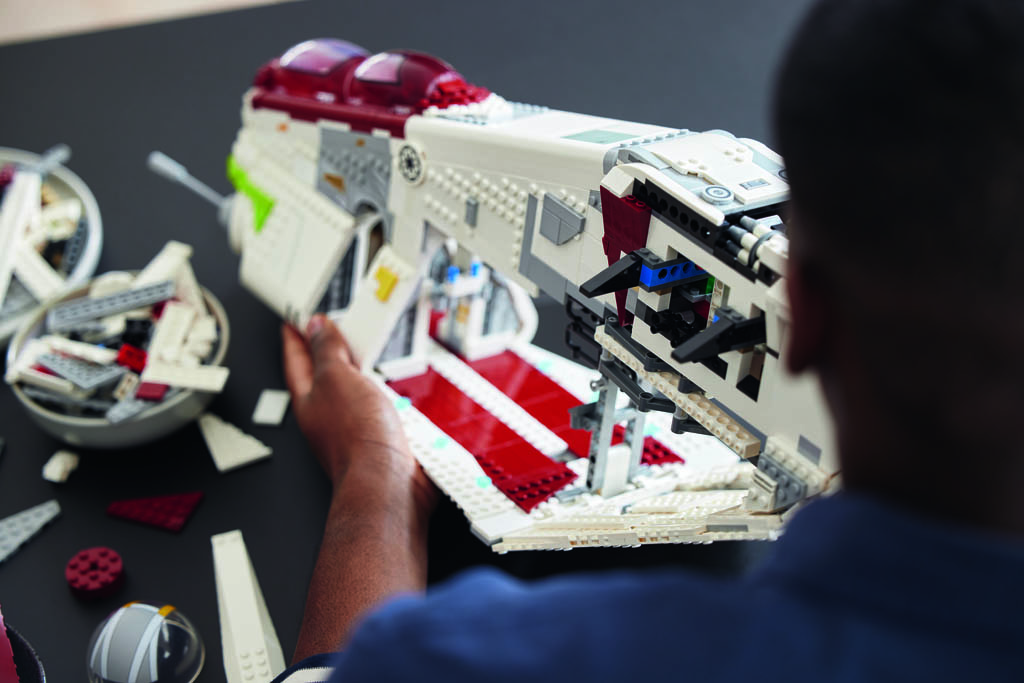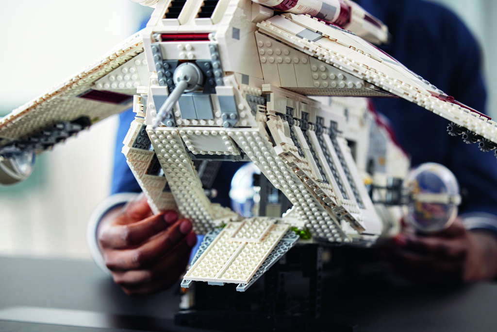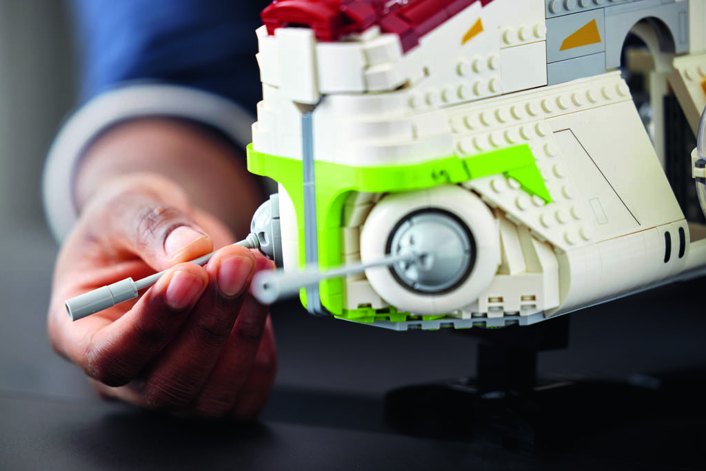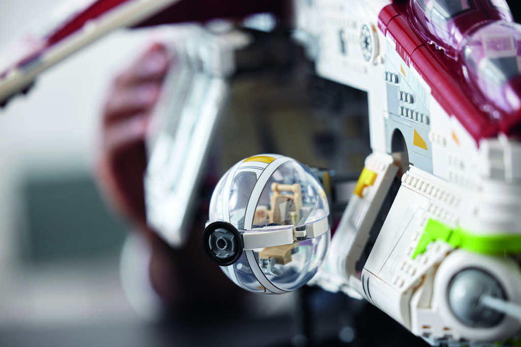 Les grandes portes qui s’ouvrent librement des deux côtés font partie des plus grandes pièces mobiles jamais créées dans une construction LEGO Star Wars et l’ensemble est complètement ouvert au-delà du nez de l’engin. Parmi les autres fonctionnalités, on remarquera les capsules abritant les artilleurs qu’on peut déployer, ou les canons articulés sur des rotules à l’avant de la machine.