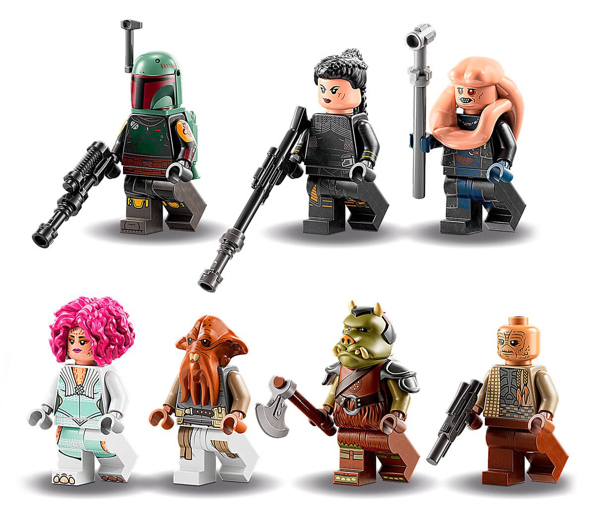 Dans cette boîte inspirée de la série The Book of Boba Fett, on trouve de quoi assembler un palais modulable et sept minifigs : Boba Fett, Fennec Shand, Bib Fortuna, une danseuse Theelin, un Quarren, un garde Gamorréen et un garde Weequay.