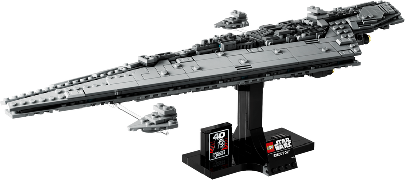 Ce gros vaisseau (43cm de long pour 18cm de large) est accompagné d’une petite plaque célébrant le 40ème anniversaire du Retour du Jedi. Et de deux micro Star Destroyers pour l’escorter. Tout ceci semble plutôt réussi, et bien moins encombrant que les gros UCS !