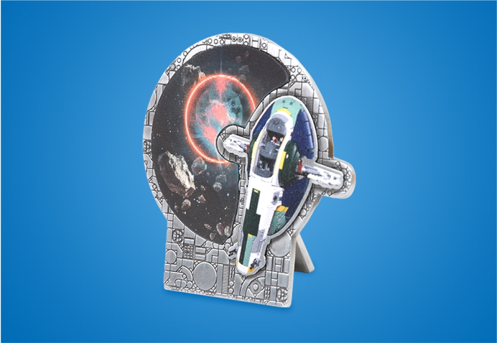 - La pièce lenticulaire LEGO Star Wars Jango Fett’s Firespray-Class Starship Lenticular Coin en échange de 2500 points (env. 16,67 €).