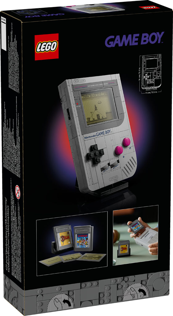 Au programme, il s’agit d’une reproduction de la célèbre console de Nintendo à une échelle proche de 1:1, avec tous ses boutons, connecteurs et décorations diverses et variées. La console est livrée avec deux cartouches brick built de The Legend of Zelda: Link’s Awakening et Super Mario Land, ainsi qu’avec 3 « écrans » interchangeables. Des supports d’exposition sont également prévus pour exposer le tout dans votre vitrine aux côtés de la véritable machine.