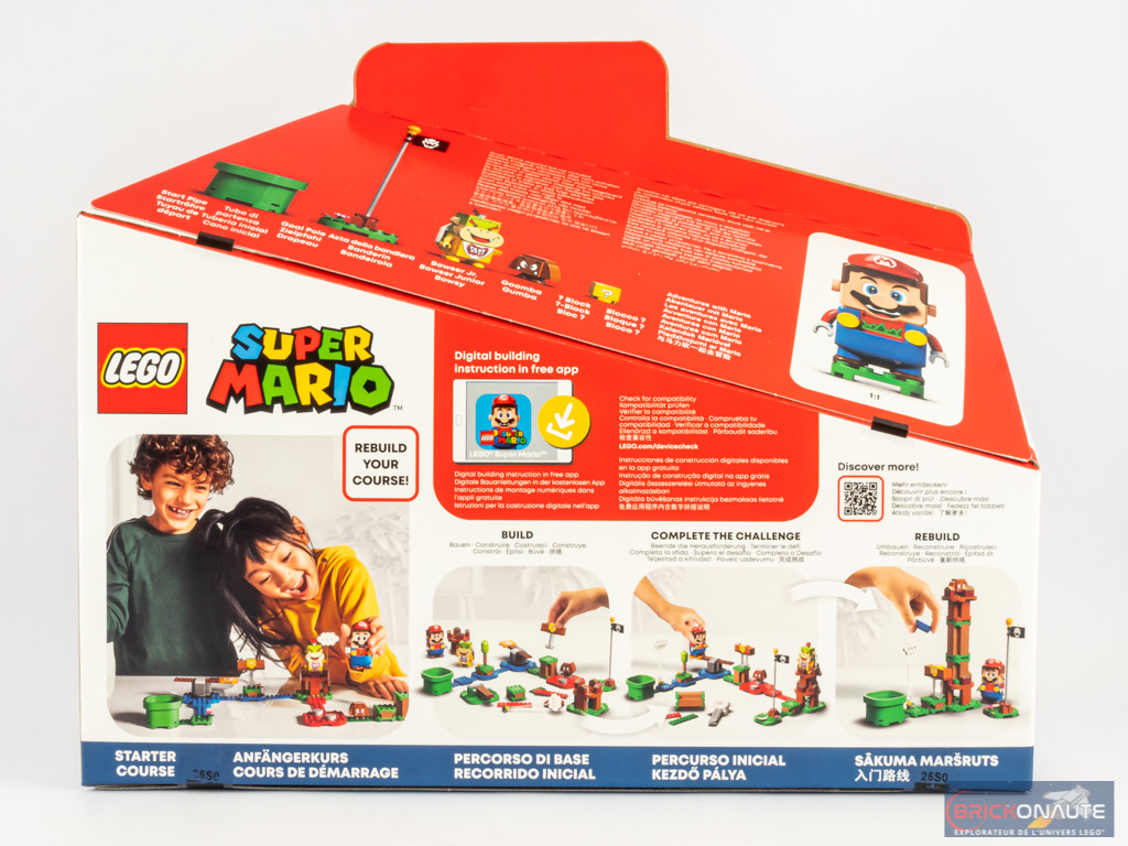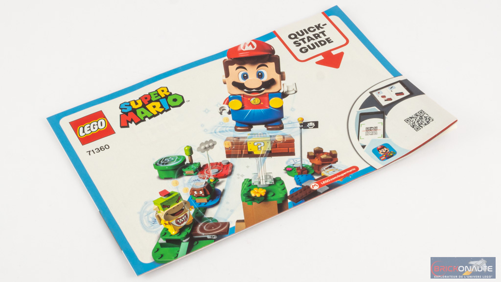 Comme je vous le disais plus haut, au déballage de la boîte, pas de notice d’instructions. Un simple guide de démarrage rapide nous indique comment installer les piles dans la figurine de Mario, et nous invite à télécharger l’application dédiée pour accéder à la notice de construction. Les pages suivantes nous montrent quelques uns des packs d’extension (qui permettent d’agrandir votre « niveau »), la série de 10 ennemis à collectionner en sachet (71361 LEGO Super Mario Character Packs – 3.99 €) ou encore les Power-Up Packs qui offrent à Mario de nouveaux pouvoirs sous la forme d’une nouvelle tenue.