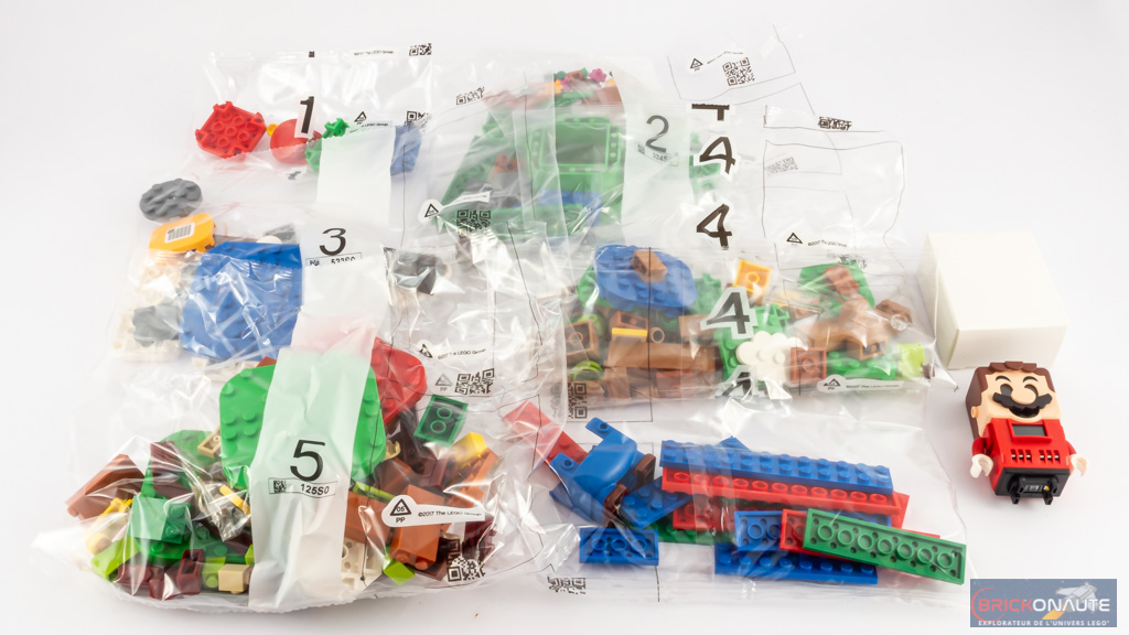 A l’intérieur, on trouve 5 sachets de pièces numérotés et une petite boîte en carton contenant la figurine de Mario. Pas de notice d’instructions : elles seront à retrouver dans l’application dédiée. Un simple guide de démarrage rapide nous montre, comme son nom l’indique, par où commencer. Pas de stickers non plus : toutes les pièces sont tampographiées ou revêtent des autocollants pré-appliqués.
