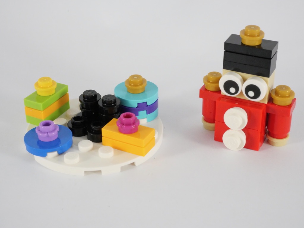 La construction ne prend pas plus de 5 minutes, et est très simple. Sur une round plate de 6×6 tenons, on ajoute les bottes puis quelques cadeaux. On construit alors le petit soldat, dont le corps est constitué d’un bracket rouge. Une plate dépasse sur sa partie supérieure pour constituer les épaules, et le visage consiste en une simple brique tan avec deux yeux tampographiés. On termine avec son chapeau, puis en le fixant sur un dish blanc lui même inséré dans la fente prévue à cet effet à l’intérieur de la boule.