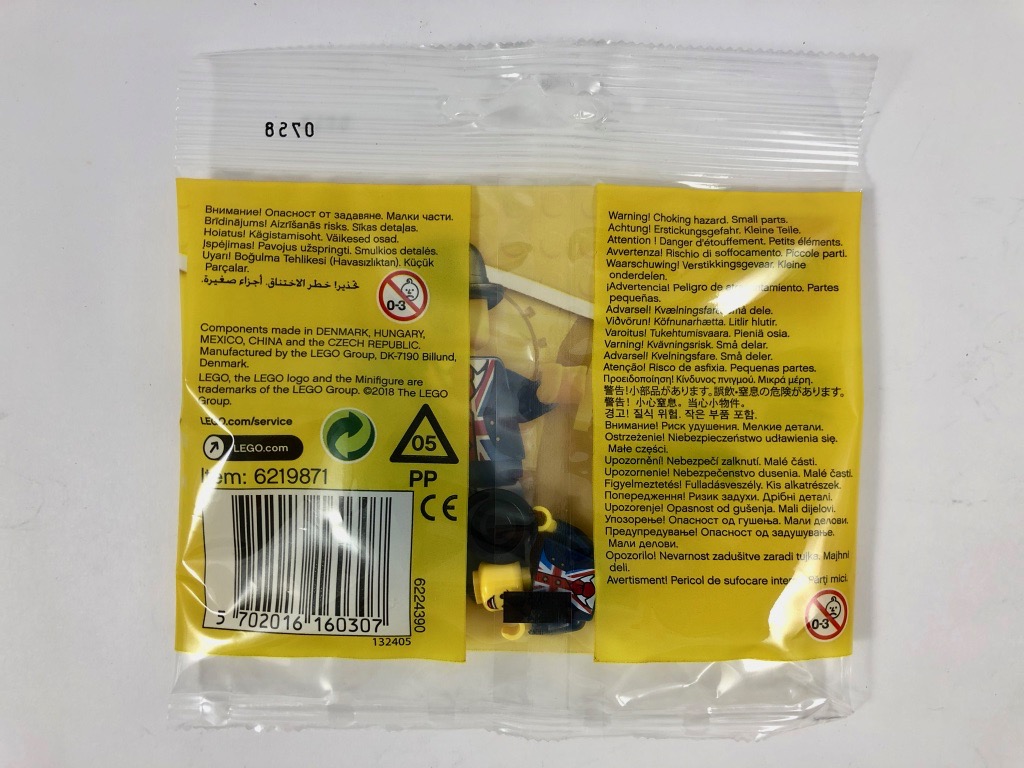 Sur le sachet, le personnage est représenté sur un fond jaune sur lequel on devine quelques monuments emblématiques de Londres, comme le Tower Bridge et Big Ben. Au dos, rien de spécial si ce n’est les mentions légales, et une bande centrale transparente qui permet d’apercevoir les pièces contenues dans le sachet. Elles sont au nombre de cinq : Lester n’a pas la chance de disposer d’un socle d’exposition comme le Royal Guard.