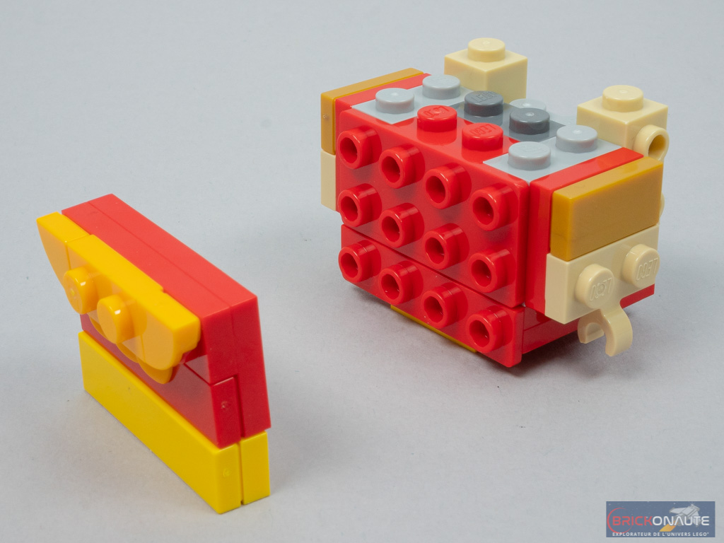 On retrouve la petite boîte légèrement allongée habituelle pour ces BrickHeadz « saisonniers ». Elle arbore de jolies couleurs rouge et or, traditionnellement associées au bonheur et à la bonne fortune en Chine. On y trouve 4 sachets de pièces non numérotés et une plate noire de 6×6 tenons, ainsi qu’une notice d’instructions de 64 pages pour 64 étapes de construction. Parmi les éléments intéressants, on notera surtout les deux yeux tampographiés sur une sphère blanche.