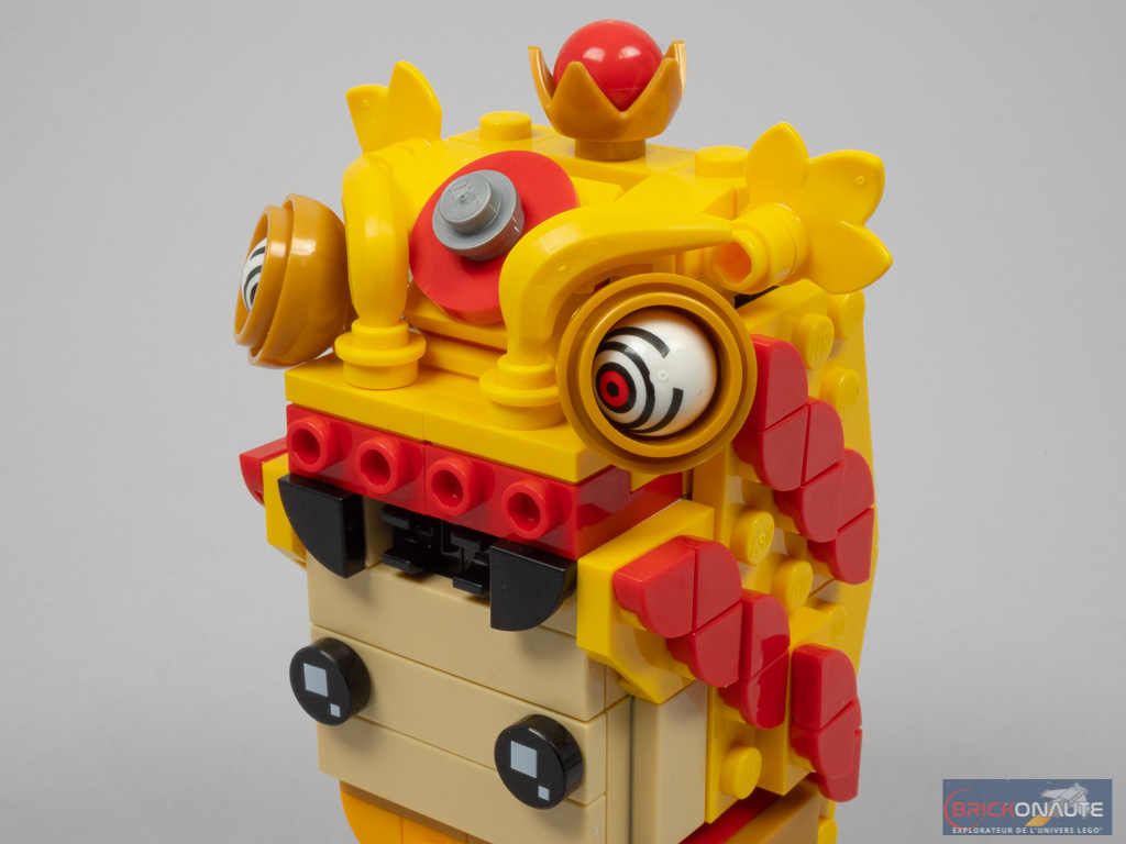 La conception des côtés et de l’arrière du personnage sont assez classiques. Il faudra juste veiller à bien aligner entre elles les petites « écailles » rouges. Les deux gros yeux sont fixés à la structure par l’intermédiaire de supports transparents, parfois utilisés dans les séries de minifigs à collectionner. En guise de « sourcils », ce sont deux bananes que nous retrouvons. Et pour les moustaches, deux queues de chat oranges.La bouche est clipsée juste au-dessus du front du danseur.