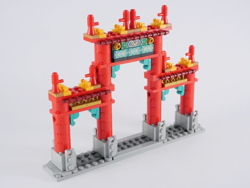 Sur une base grise, on commence par ajouter quatre « bases » grises et quatre poteaux rouges. Les pièces supérieures de ces poteaux sont trouées et permettent d’y fixer des éléments couleur teal. Les poteaux sont alors assemblés deux par deux par un fronton en partie supérieure, et un second fronton plus élevé rassemble les deux poteaux centraux. On retrouve ici les motifs déjà vus dans le set 80105 Chinese New Year Temple Fair.