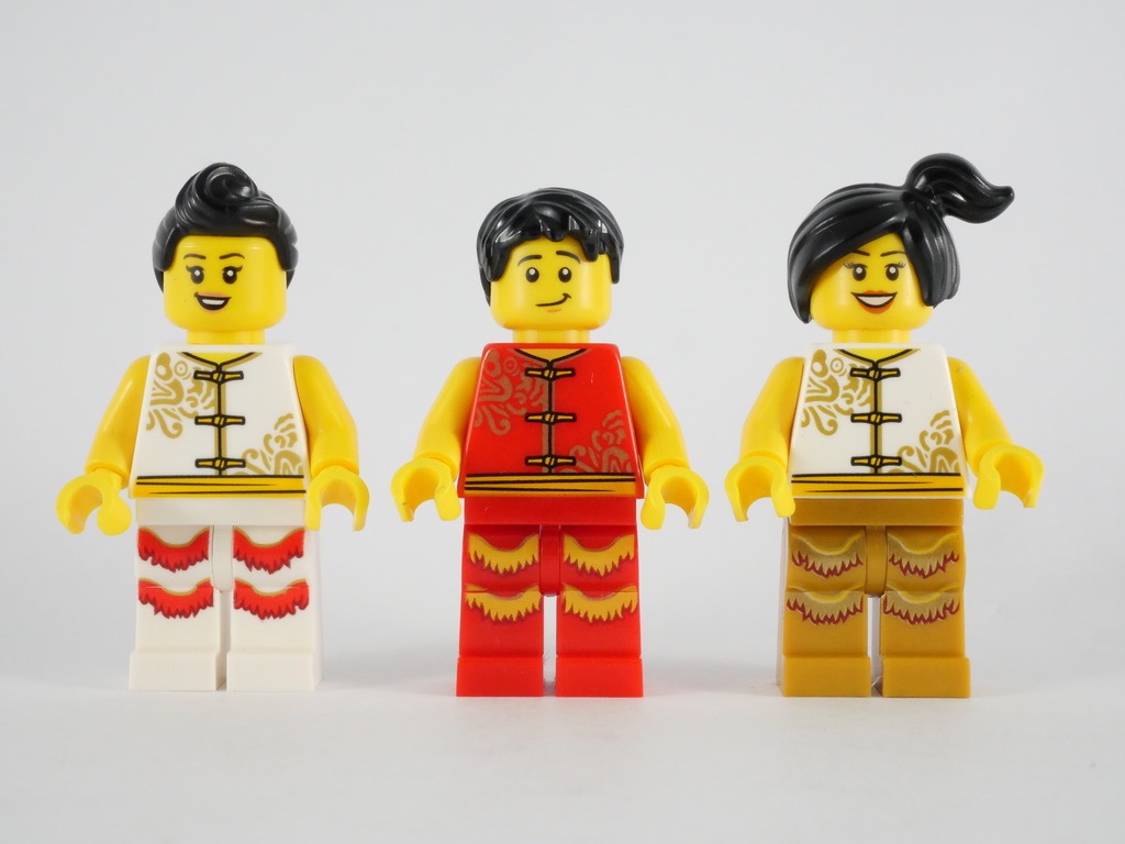 Le maire, aux cheveux grisonnants et en costume cravate, est « armé » d’un pinceau pour finaliser la peinture des lions et ainsi leur donner vie. La minifig la plus « importante » de cette boîte est sans doute le garçon en costume de rat. Il porte une robe traditionnelle avec de jolis motifs couleur or. Nul doute que ce dernier personnage sera recherché par les collectionneurs !